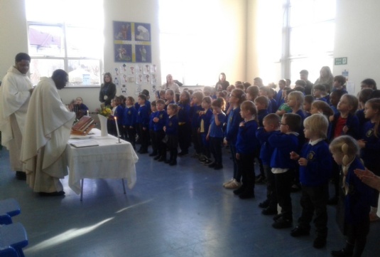 May is the month of Mary. Keystage 1 and EYFS made crowns of flowers and processed with a flower to lay at the Mary alter outside on the field. Some of the children led the ceremony with prayers and song.