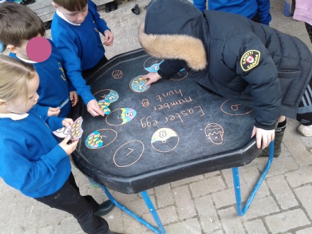 The children enjoyed applying their maths skills with our Easter egg hunt game. I set it up by hiding the parts around our outside area and the children went off and identified matching the numeral to the amount.