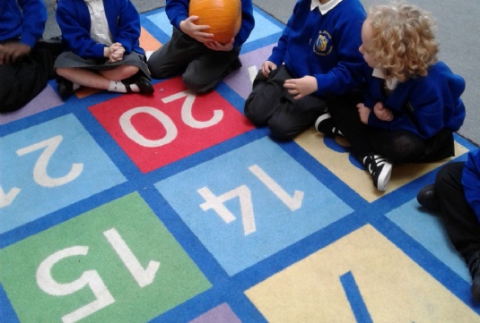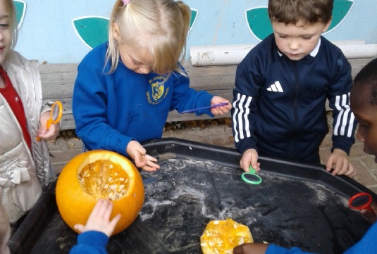 We talked about signs of autumn and looked at the pumpkin. We explored what it felt like and how heavy it was. The children used magnifying glasses to make careful observations of the pumpkin.
