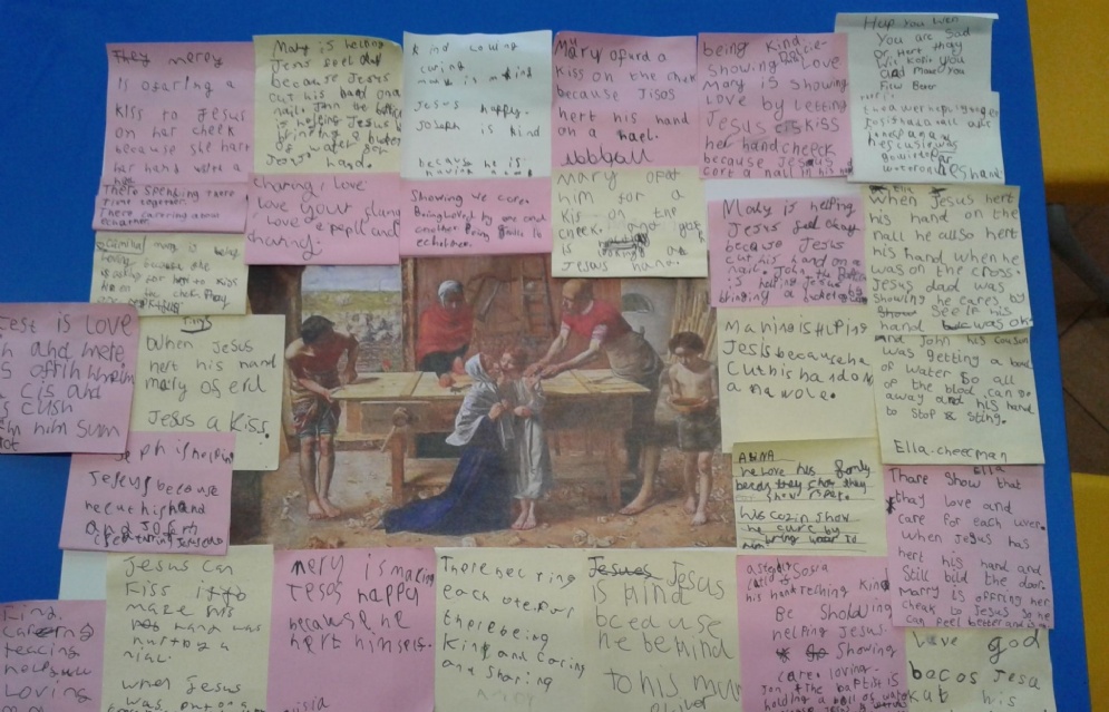 We looked at the picture Millais' Carpenter's Shop, De La Tour's, Christ in the Carpenter's Shop. Jesus was in his father's carpentry shop, he hurt himself on a nail and his mother, Mary, offered him her cheek. His cousin brought him a bowl of water to help him. This picture showed people being kind, caring and showing their love to each other.